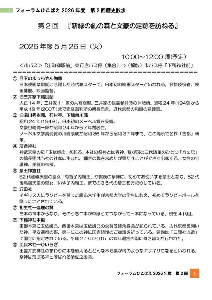 サークル活動 【歴史散歩】2026年 5月26日(火)『新緑の糺の森と文豪の足跡を訪ねる』 2026.04.18 2026年5月の歴史散歩は、5月26日(火)『新緑の糺の森と文豪の足跡を訪ねる』です。参加費:参加費1,000円+交通費 参加締切は2026年5月18日(月曜日) 問い合わせ先:予約はこちらまたはお電話で☎075-463-0438 Tweet Share Hatena Pocket RSS feedly Pin it